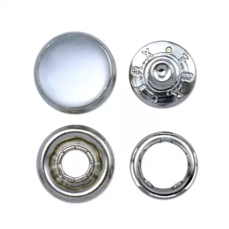 4 parts in a set: Pearl prong, socket, stud & bottom ring prong. The pearl prong is applied with socket, bottom ring prong with the stud. Our pearl snap fastener has excellent hold power on fine fabrics and causes small fabric damage. Customized logo on the top prong is available.