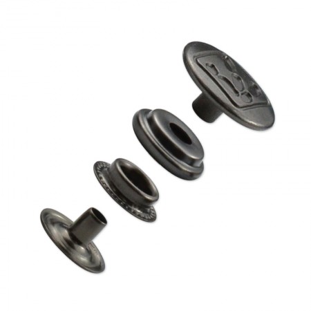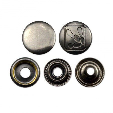 4 parti in un set: cappuccio, presa ad anello, perno e stelo. Il cappuccio è applicato con la presa ad anello, lo stelo va con il perno. Il nostro bottone a pressione ha un'eccellente capacità di tenuta su tessuti fini e causa piccoli danni al tessuto. Logo personalizzato sul cappuccio disponibile.