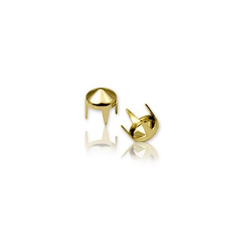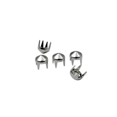 圓錐形爪珠又可稱為圓形尖錐爪珠,這類爪珠最常用於龐克風的物品上。我們的爪珠擁有四爪或4爪以上的設計,每支爪子能輕易穿透皮革或布料安全無虞的向內彎折固定在物品的背面。DIY使用者可利用手工方式或簡易模具來操作,大量使用者可利用機台搭配正確尺寸的模具將爪珠釘牢於產品上。